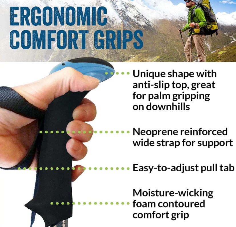 Dobbelt håndtag foldning af vandrestang, luft af justerbar 2-delt foldningsvandring / vandreture / vandrestænger, der kollapser til kun 13,5 tommer og vejer mindre end 11 ounces hver. Den perfekte gave til rejseelskeren. Vælg de poler, der passer til din højde og dit valg af greb.