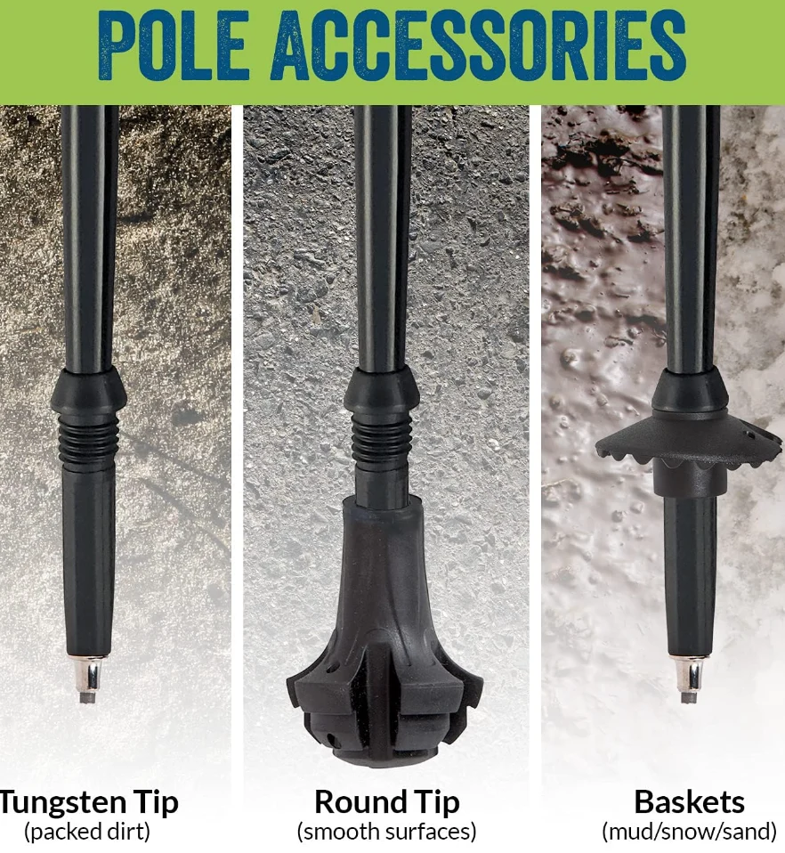Længere størrelse (for de 5'7 "op til 6'2") udvidede polerne, justering fra 115 cm til 135 cm (45,25 "til 53"). Hver vejer kun 11 ounces. Kropsproportioner er unikke, derfor er den mest nøjagtige størrelsesmåling fra jorden til toppen af din underarm, når det er parallelt med jorden, og den længere størrelse er for dem med en underarm-til-jord-måling af 44 'til 52 ".