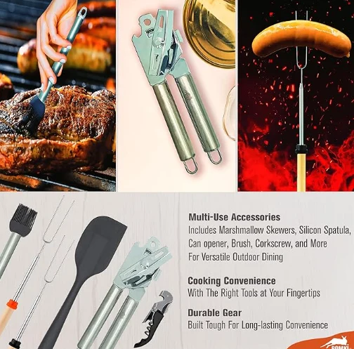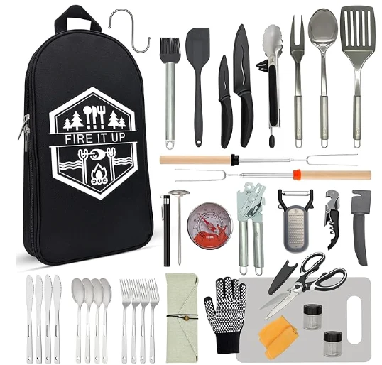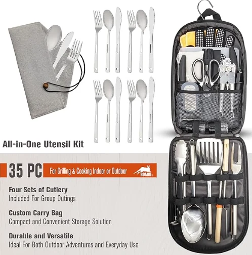Udendørs campingkogegrej opbevaringspose Denne 35 pc camping -madlavningsredskaber er en komplet løsning til dine udendørs madlavningsbehov. Det inkluderer et campingkøkkensæt og campingredskaber madlavningssæt, alt sammen pænt pakket i en brugerdefineret taske med ekstra rum og to baglommer. Sættet er designet til at imødekomme alle dine essentielle camping -madlavning, hvilket gør det til en uundværlig tilføjelse til dit campingudstyr